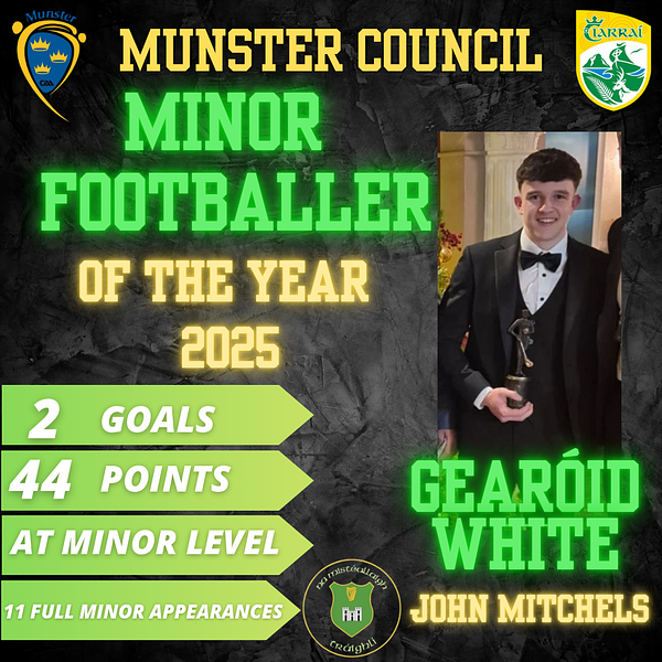 Congratulations to John Mitchels player Gearóid White, who received the Munster Minor Footballer of the Year Award at the Munster GAA Awards 2025, held last night in the Muckross Park Hotel, Killarney.