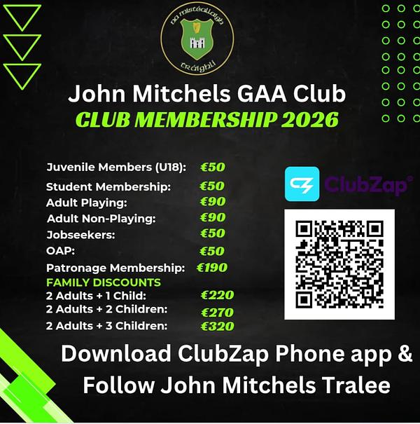 Membership can be paid via ClubZap https://johnmitchelsgaa.clubzap.com/membership_signup or through the Club