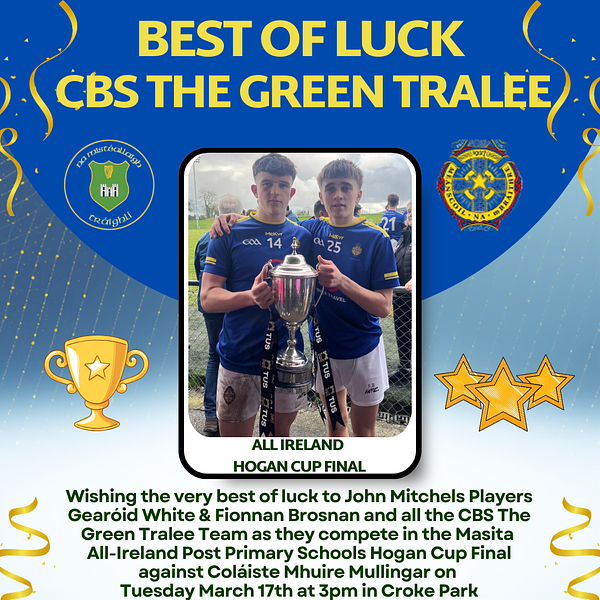 Best of luck to the CBS The Green Tralee team in the Masita All-Ireland Post Primary Schools Hogan Cup Final this Tuesday, St Patrick's Day in Croke Park! ๐๐๐