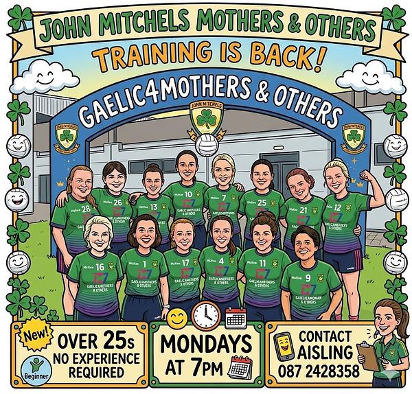 Training for John Mitchels Mothers & Others has resumed. Training takes place on Monday evenings at 7pm. New players welcome. No experience required. Contact Aisling 087-2428358